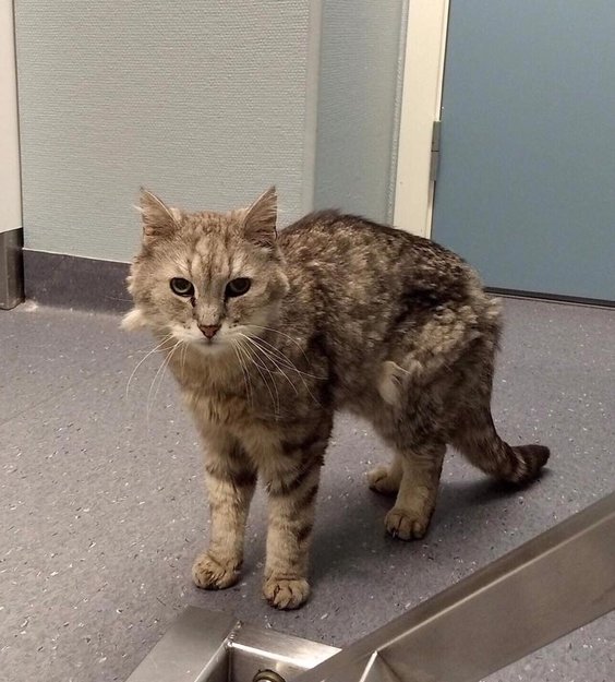 Kastrert hannkatt, voksen, antagelig opp mot 10 år gammel. Dårlige tenner, utmagret og dehydrert. Meget tillitsfull. Gammel skade eller medfødt skade til ene hoften.