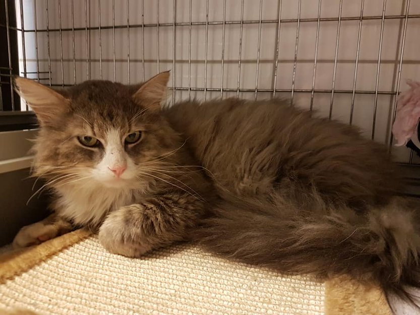 Stor katt. Ukastrert og umerket hannkatt, alder ukjent. Gråtigret over ryggen, masse tover i pelsen, sitter som et panser på katten. Tillittsfull men forsiktig.