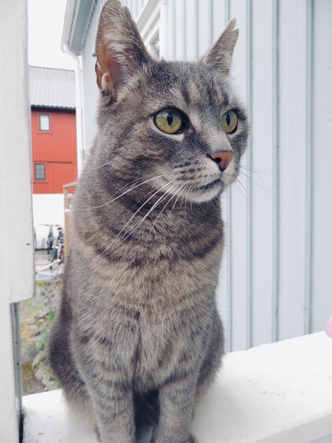 Tom er en grå skipskatt. Han har 6 tær på potene. Hakk i øret. Magen er litt stor slik de ofte er på kastrerte katter.