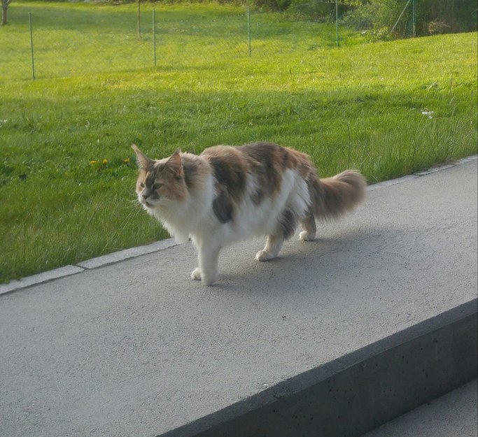Ho lyder namnet Cleo og kjem vanlegvis når ein roper på henne. Cleo var ute som vanleg, men kom ikkje heim igjen. Etter fleire turer ute der vi ropte, lager lyder med matskål, godteri og leika hennar, har ho ikkje svart og er heller ikkje dukka opp enda. Alt dette er lyder der ho normalt kjem springende.