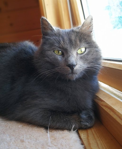 Mellomstor hunnkatt. Kan virke litt hjulbeit. Hun har litt forandring i pelsen på venstre flanke. Kan virke litt sky.