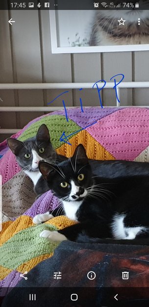Katten vår Tipp som vi adopterte fra Dyrebeskyttelsen har blitt Borte for oss. Vi har hatt utetilvenning på terrassen på 2. etg med Tipp og hans bror Svarteper og i et uoppmerksom øyeblikk forsvant han.