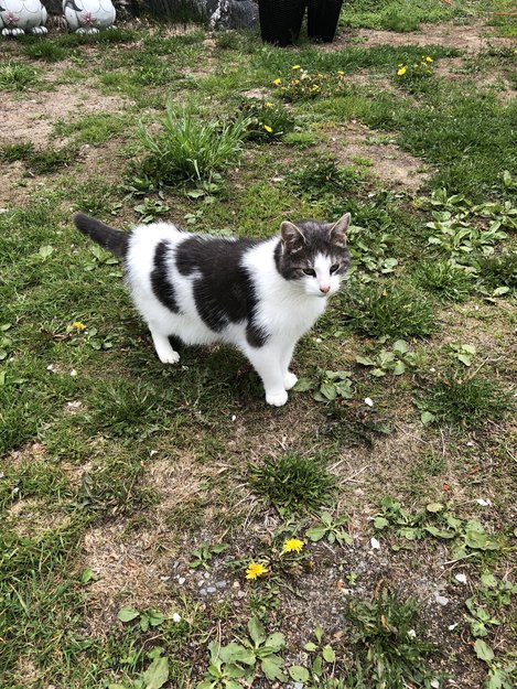 Grå og hvit ekstremt kosete pusekatt. Usikker på kjønn og om den er kastrert. Den er ikke chippet. Vil ikke gå og følger etter meg når jeg holder på ute. Veldig kort hale.