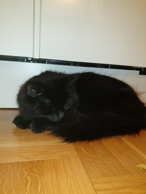 Langhåret sort hannkatt, m litt brunlig skjær. Sennepsgule øyne. 2 år gammel. Tillitsfull