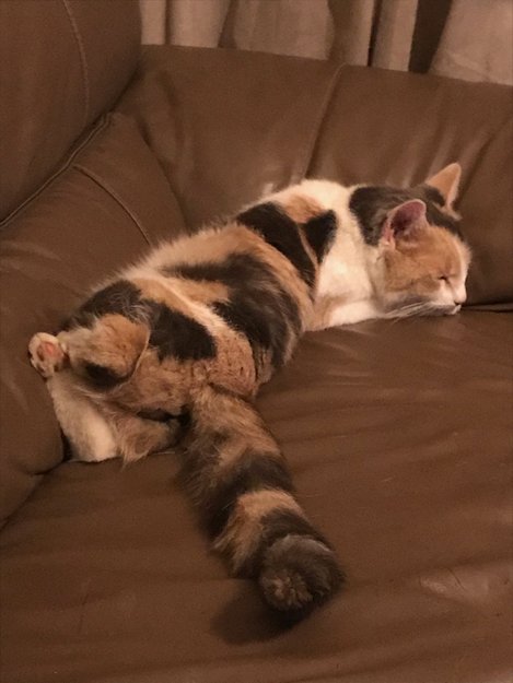Tre farget liten jente. Har på et slitt halsbånd. Er 4 år gammel. Glad i mennesker, men går ikke på ukjente steder. Lyse brune øyne