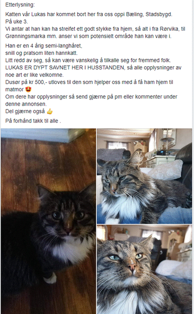 Vår nydelige og snille kattemons ble borte som lyn fra blå himmel her rett etter påsken, Katten var sunn og frisk, og ellers oppførte den seg slik den alltid gjør. Mjauet ivei som om den trallet på en sang , litt mer rastløs enn ellers, men rekner med at det duftet kjendte damebekjendskap der ute..så ut bbar det etter noen munnfull mat..og siden har ikke vi sett nå til den :(