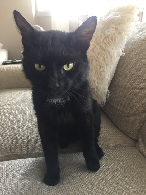 Katten har helt svart kort pels, med unntak av et lite hvitt parti på brystet. Har gule øyne. Har kloremerke på langs av hele venstre øre.