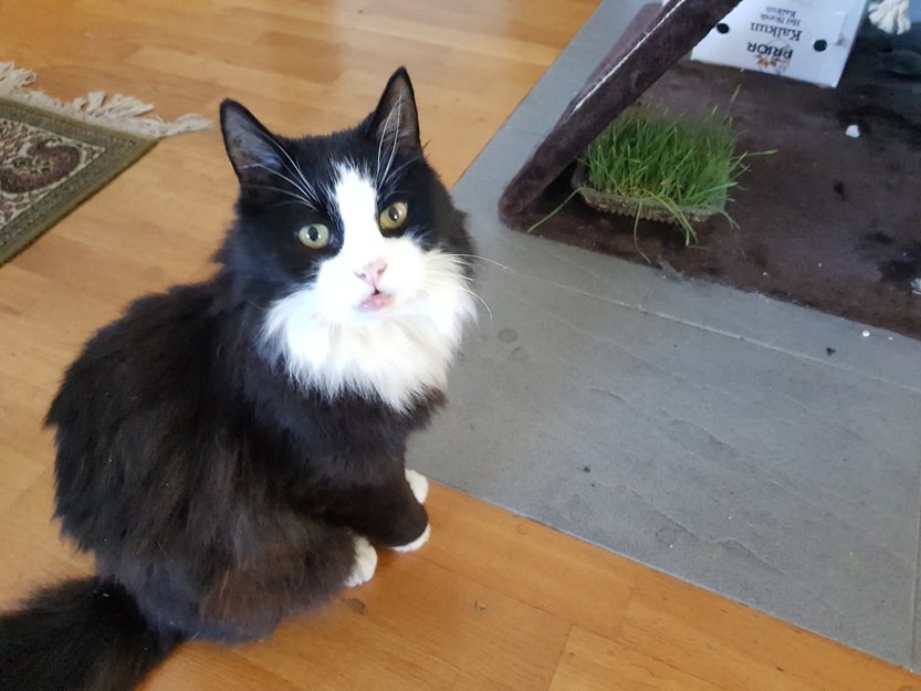 Han har et grønt "mygg-halsbånd" med en metall-kapsel som inneholder telefonnummer. Han er svart/mørkebrun med hvite poter, hvit under hake og hvit i "T-sone". Han prater en del, og i blant setter han seg ute og mjauer veldig dypt og sterkt, nærmest rauting. Han er glad i kontakt og ikke redd mennesker.