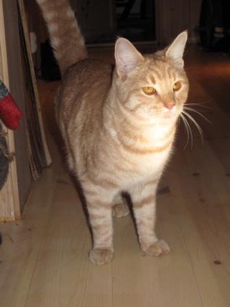 Sterk og robust hankatt med stripete hale. Nesetippen blir mørk når han drikker pga en brannskade som liten. Karakteristisk mjauing som til vanlig er kurrende, men som ellers er veldig høy og sterk.