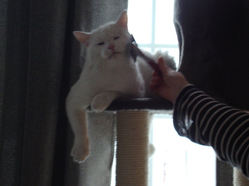 Han er kanske stor katt men litt kortere hale enn vanligvis. Blå øyne og vanlig hørsel.Ikke kastert, helt hvitt.