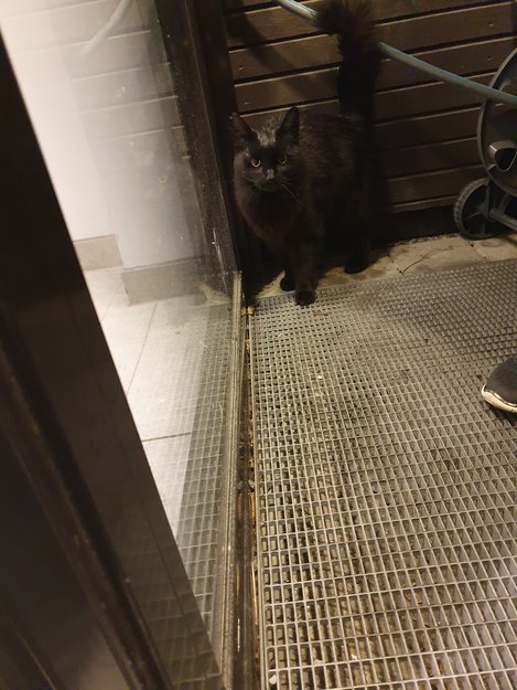 Finner katt utenfor blokk i regnet. Mjauer mye og vil veldig gjerne innom i blokket. Veldig våt og kald.