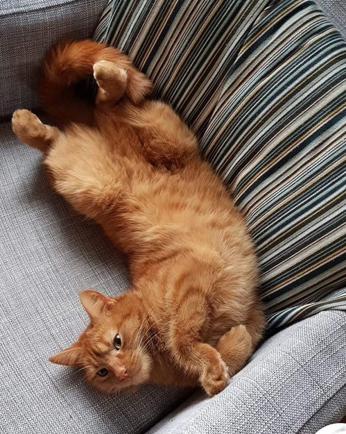 Rødbrun, nydelig pels. Tigerstripet (lysere brune striper)
