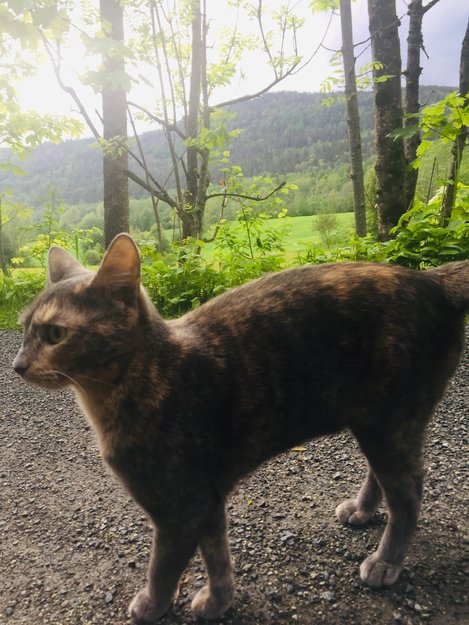 Tynn og smidig katt. Sosial og samtidig vill av seg når hun er ute. Elsker å følge og gå med oss på tur. Men liker å utforske selv også. Har trekk fra siameser i seg. Ung katt.