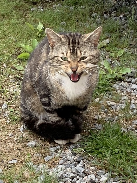 Fremmed katt som går rundt og mjauer og er tydelig oppsøkende.