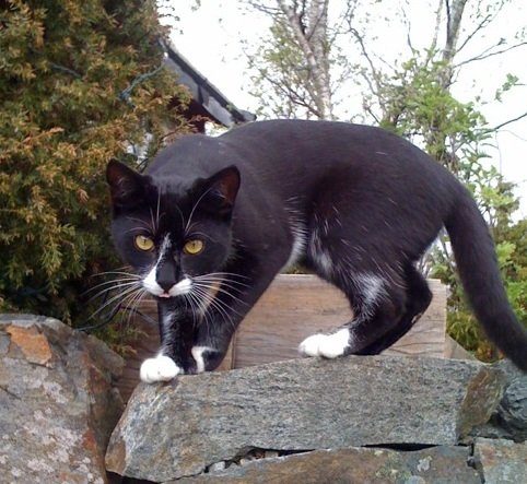 Dette er Kiba, vår 2 år gammle korthåret svart og hvit skipskatt. (Hun har en ekstra klo på hver fot fremme) Hun er veldig snill! Hun er for det meste svart men litt hvit i ansiktet, på potene og under magen. På ryggen er hun barbert helt med halen etter at hun nylig har vært hos veterinæren. Om hun forsatt har det på, så har hun et svart og hvit halsbånd med en liten adresse beholder på.