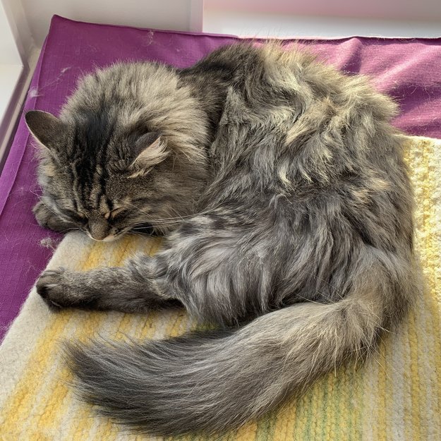 Vakker pus, kastrert hannkatt, mye pels. Tigret på beina, mer tofarget, grå og hvit, på mage- rygg.