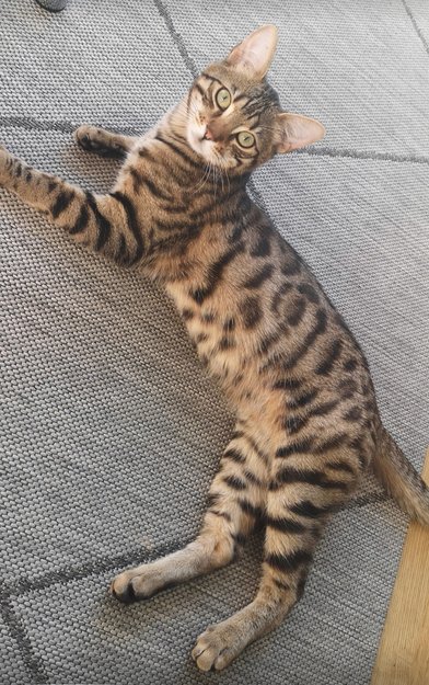 Slank med mørke tigerlignende striper på kroppen og leopardlignende prikker/spotter på magen. Leken, kosete, men mest sannsynlig skvetten ettersom han ikke er vandt til å være ute. Pratsom. Grønne øyne med blå ring rundt pupillene. Han er ikke ID-merket eller kastrert.