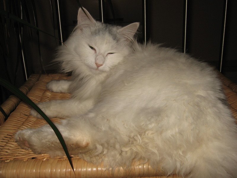 Hvit med litt grått på hodet. Glad i kos og maler lett.