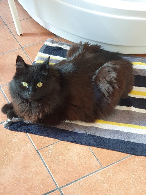 Morris er langhåret og helt svart i pelsen (med litt brunsvart skjær i lyset), og bustete hale.