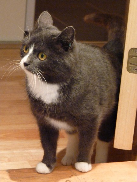 Korthåret, grå med hvite sokker, litt hvit i ansikt og hvit på bryst/buk. Halve nesen er rosa; andre halvdel grå. Gule øyne. Liten av vekst. Ekstremt kosete, men litt skvetten/forsiktig.