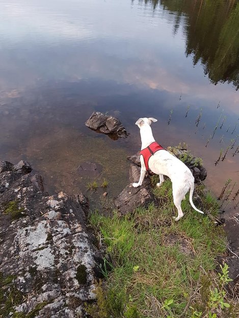 Hunden fikk panikk da det kom et kraftig tordenvær, han fikk opp ei dør og løp ut. Vi har klart å følge vitenobservasjoner over Holje, Olstad og Ødegård til Trondset. Deretter ingen spor eller observasjoner