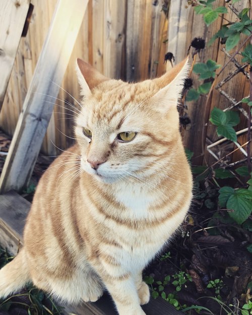 Relativt stor, 6kg. Voksen hannkatt, oransje og korthåret. Hvitt hakepartiet. Mjauer mye, vanligvis sosial og kontaktsøkende.