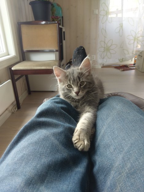 Den er helt ny. Den er liten og grå. Kosete og leken som barn er.