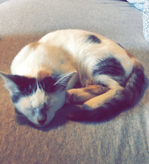 Hvit med flekker i fargene beige/orange, svart og grå. Liten i størrelsen til å være fullvoksen katt.
