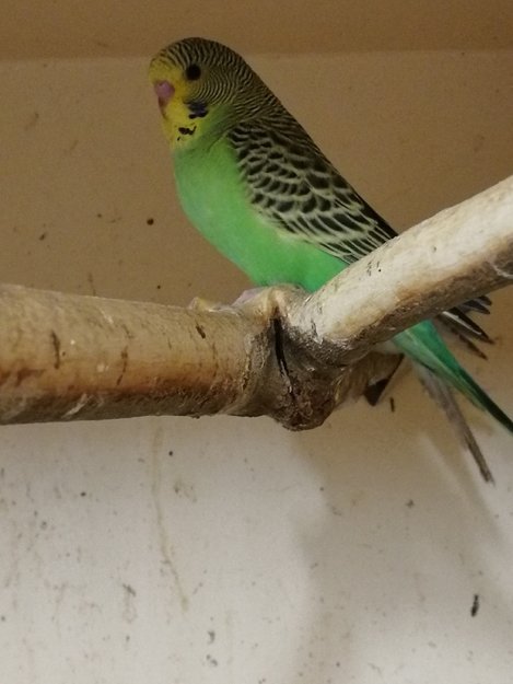 Han er en vanlig grønn/gul undulat, men han kjennetegnes ved at han har tre gule fjær bak i nakken der han egentlig skal være grønn.