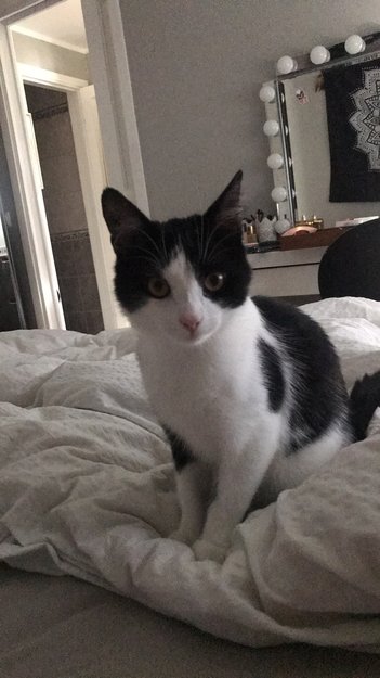 Svart og hvit liten kattunge på 9 Måneder veier ca 2kg så hun er en liten type. veldig redd for alt og alle. hun er ikke kjent i området (Bekkeliveien/Kolbotn). Veldig glad i den andre katten vår som er oransje og hvit.