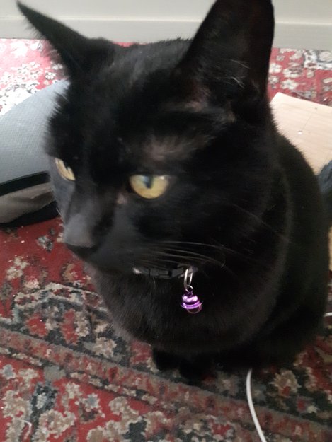 12 år kastrat. Chippet og øremerket. Har rødt halsbånd med refleks og bjelle. Veldig snill.