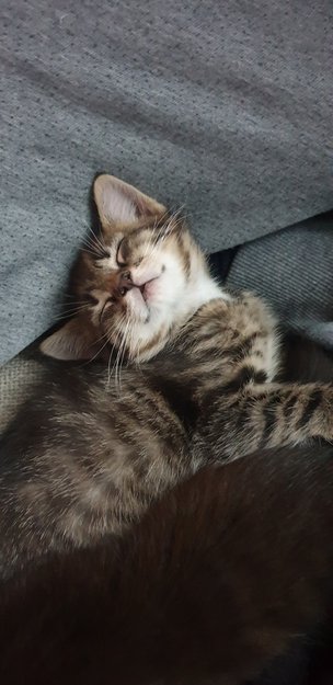 Hun er 12 uker. Gule øyne, store spisse ører,hvite poter, rosa halsbånd med tlf nr. Hun prater mye og er kosete, men hun er også sky så hun går ikke bort til hvem som helst.