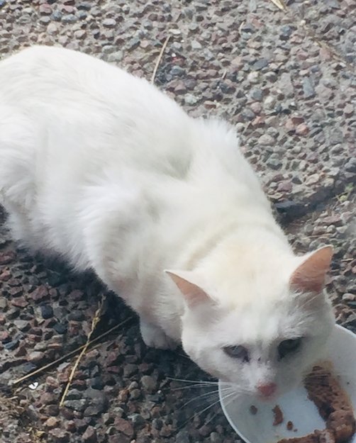 Katten har vært innom daglig og lett etter mat. Han sitter i hagen og titter inn. Den virker litt utmagret. Katten er veldig sky og unngår menneskelig kontakt.
