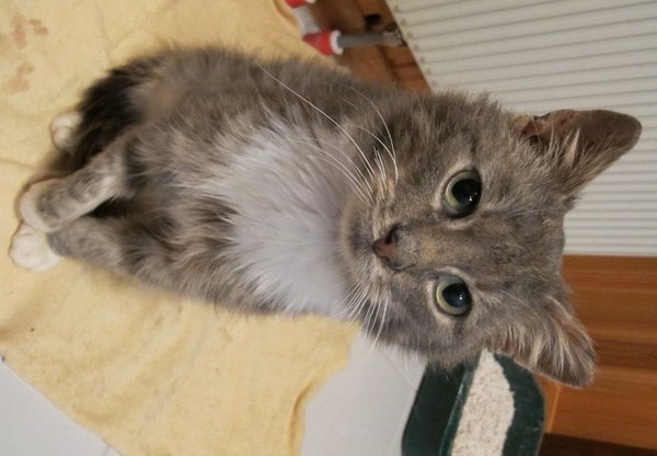 Kom til vårt hus utsultet og skadet, mulig påkjørt av bil. Tydelig folkevant og tillitsfull. Kan kun mjaue svakt. Maler straks noe kommer nær. Har vært til veterinær og der konstateres ingen brudd. Er nå på bedringens vei og legger til kroppsvekten kontinuerlig. Håper de som eier katten ser denne annonse og kontakter oss.