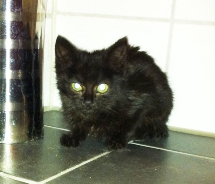 Kattunge. Ukjent kjønn og alder, men spiser tørr- og våtfôr. Mørkebrun, nesten sort pels.
