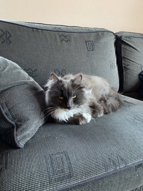 Pusen er (mørk) grå, med noe hvitt i hals og nakke. Den lyder ikke navnet sitt (Gulla), men heller lokking som «pus pus» osv...