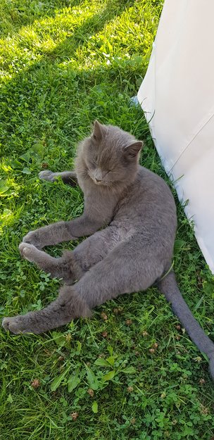 Han har fått sommerklippen og har løveklipp, med pels støvler og fullpelset hale. Han lyder navnet sitt: Cosinus. Han prater og er veldig kosete. Grå pels og gule øyne