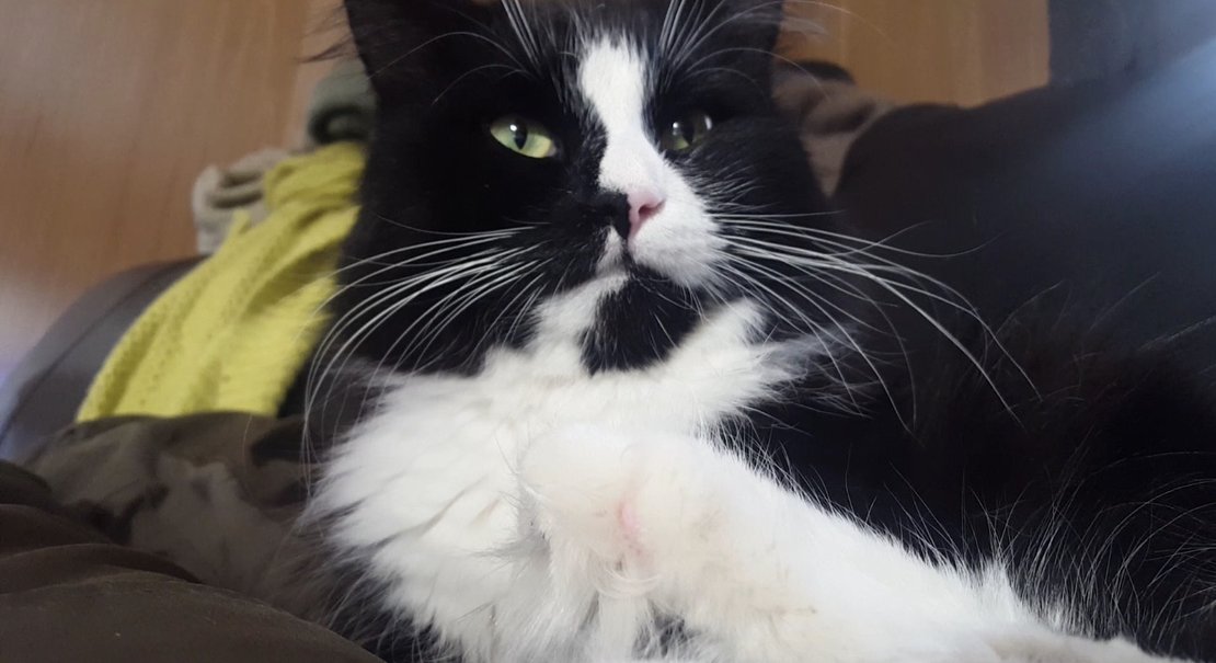 Han er langhåret, og svart med hvite flekker på brystet, i ansiktet, litt på magen og på potene.
