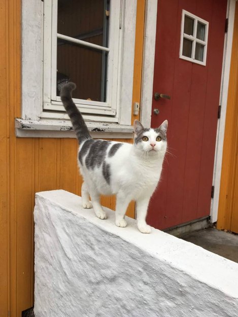 Är grå och vit. Svansen är helgrå i en lite mörkare nyans än övriga fläckar. Kan halta lite med vänstra bakbenet.