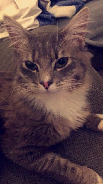 Rosa nese, lange hvite «sokker» på bakbeina, prater MYE, veldig tillitsfull, ikke ID merket