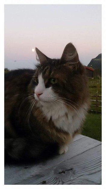 Nokså stor langhåret hannkatt på 11 år med stor buskete hale. Hvit på brystet og i ansiktet. Mest mørk grå på kroppen, noe brunt under magen. Ikke særlig kosete, men veldig på hvis det er mat å få.