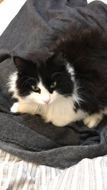 Kjennetegn er lite mjauing, lokkes bedre med mat enn med sitt eget navn og har trekt en hjørnetann. Den bor på grinnivegen hos min mor.