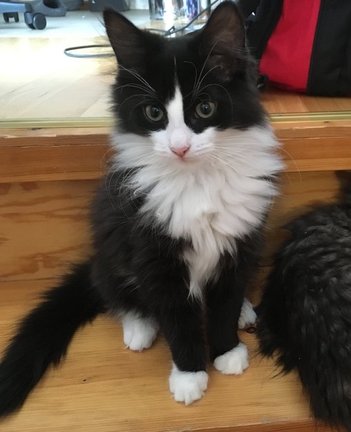 8 mnd gammel hunnkatt med hvitt bryst/mage, hvite sokker og hvit over nesen, og relativt liten av vekst. Hun er tatovert i høyre øret med «ID» som en markør på at hun er chippet. Sosial pus og ikke redd for mennesker!
