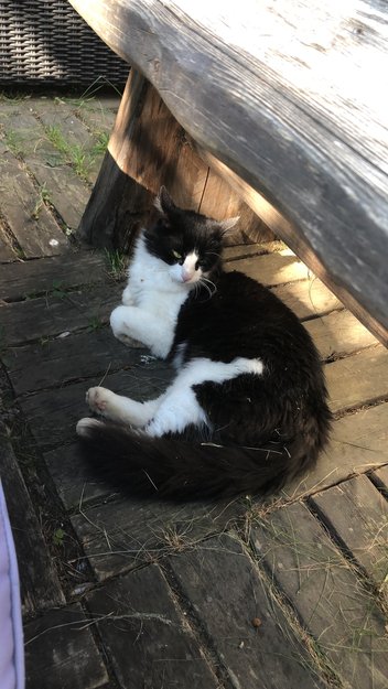 Katten satt utenfor vinduet og mjaua. Tror det er en hunnkatt men er ikke helt sikker. Hun var veldig tynn, flott og skorper rundt halsen. Ga hun mat og hun spiste opp alt i en jafs. Veldig kosete og sosial. Har ikke tatt hun med til en dyreklinikk enda men skal snart sjekke om hun er chippa.