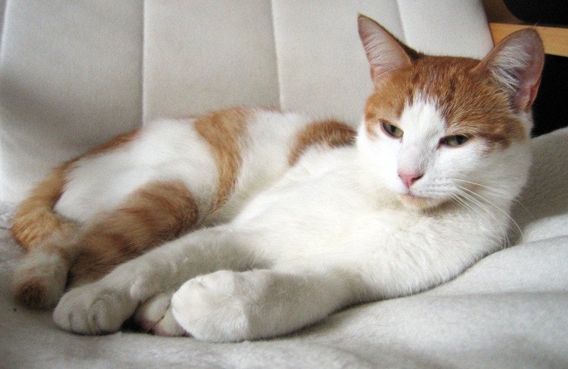 Hvit korthåret pels med rødtigrete områder: hode, ryggen, bakføtter og halen. Han har en beige flekk på haken.
