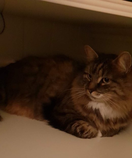 Hannkatt med normal størrelse. Har mindre pels på bakparten mot halen etter å ha blitt barbert der for noen uker siden (juni 2019) i forbindelse med et sår. Lite "hakk" i det ene øret etter slåsskamp. Sosial og ikke veldig skvetten.