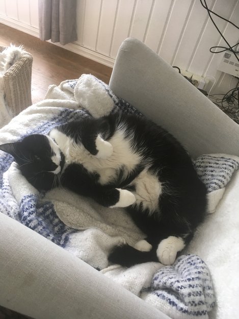 Han er en lang og stor katt på rundt 8 kg. Bedagelig og fin. Sort med hvitt i mage, poter og ansikt