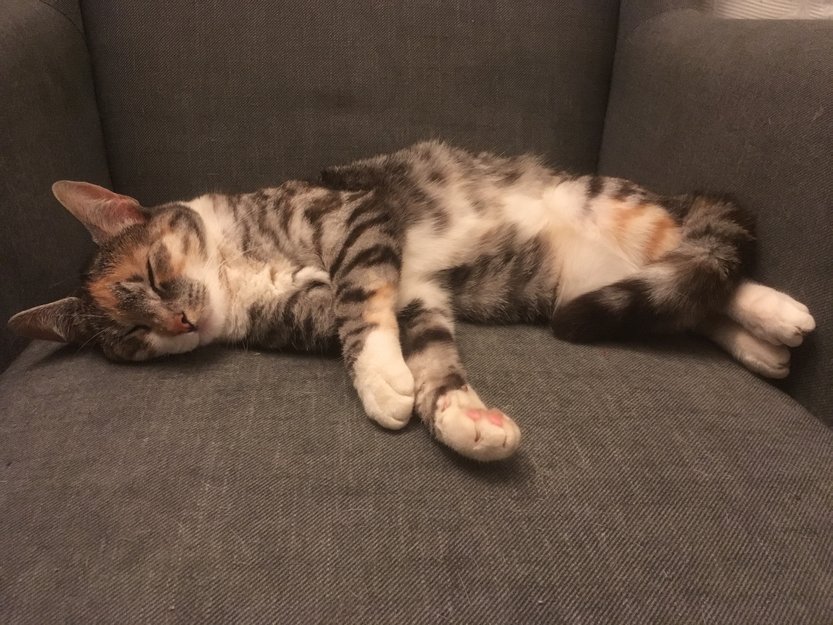Liten og slank. Makrellfarget med oransje. «Snakker» en del. Veldig kjælen.