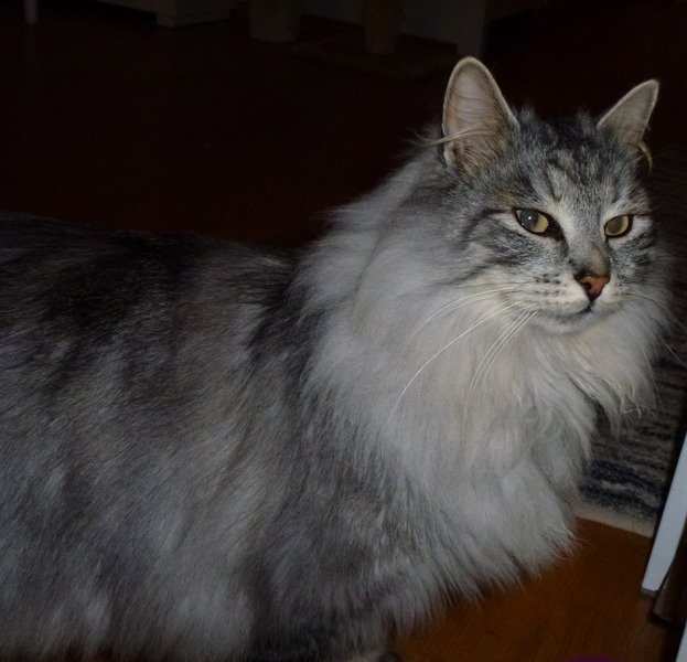Sølvgrå pels med noe svart og hvitt. Svart på potene.