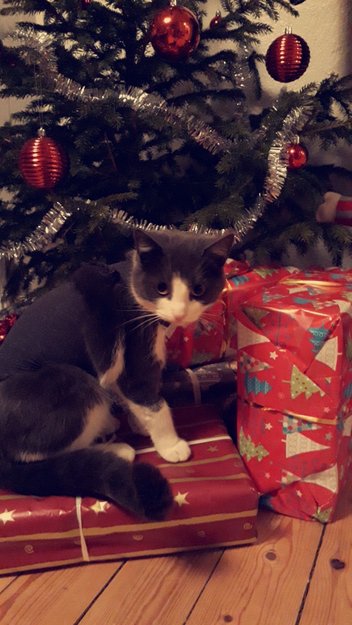 Liten av vekst. Grå med hvite avtegn i fjes og labber